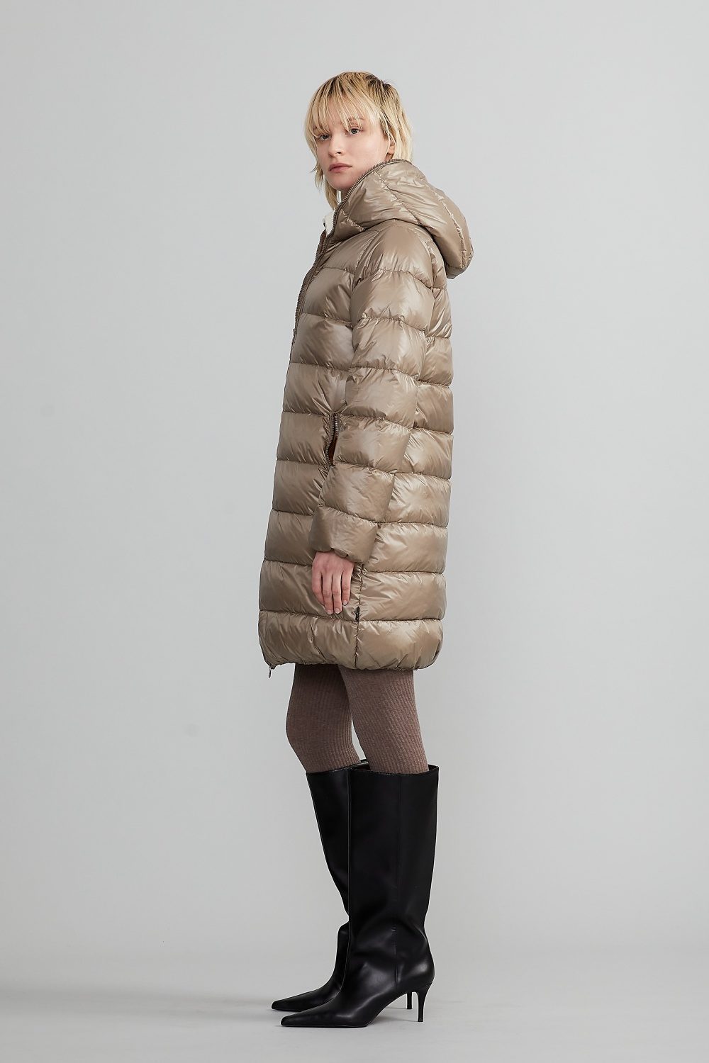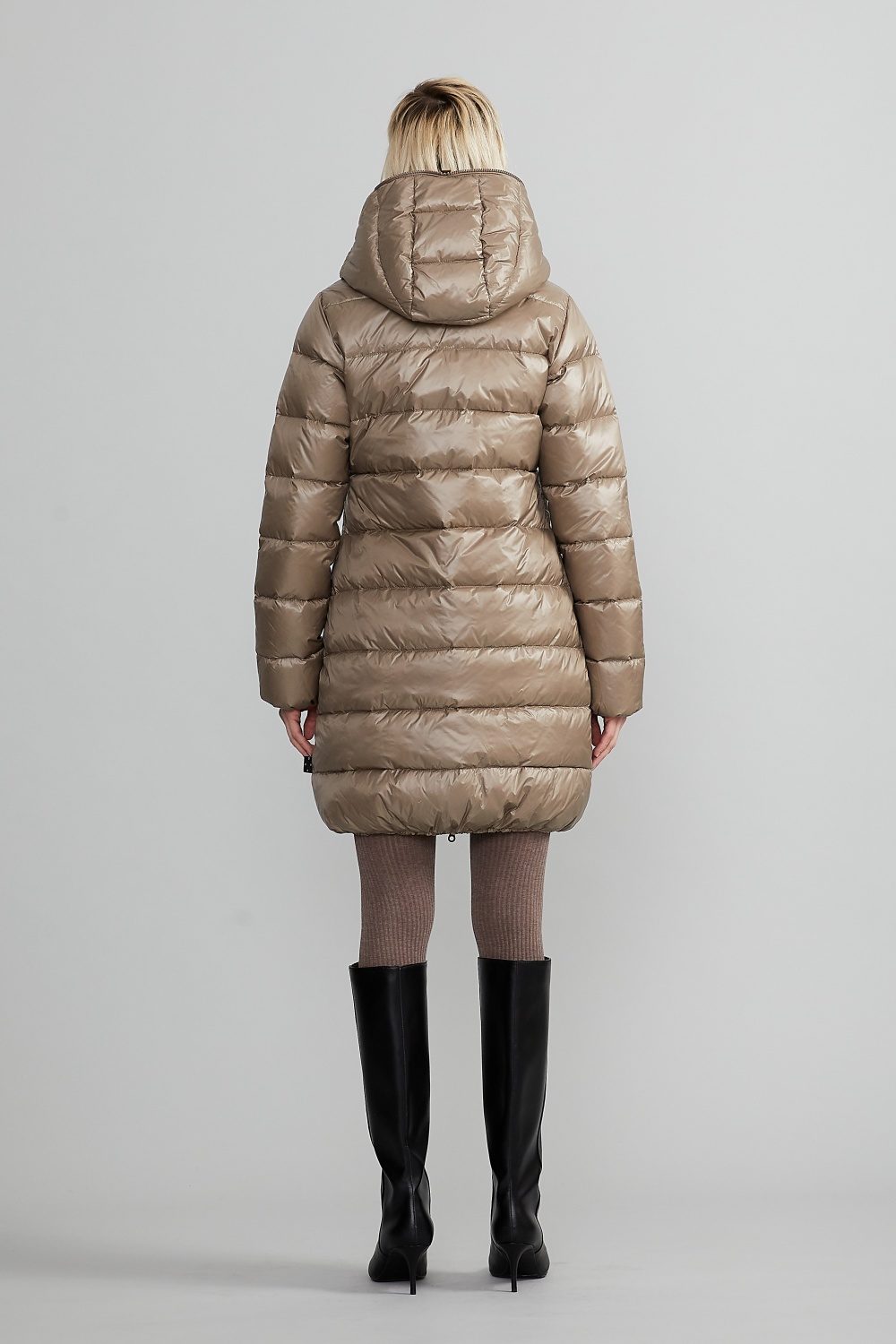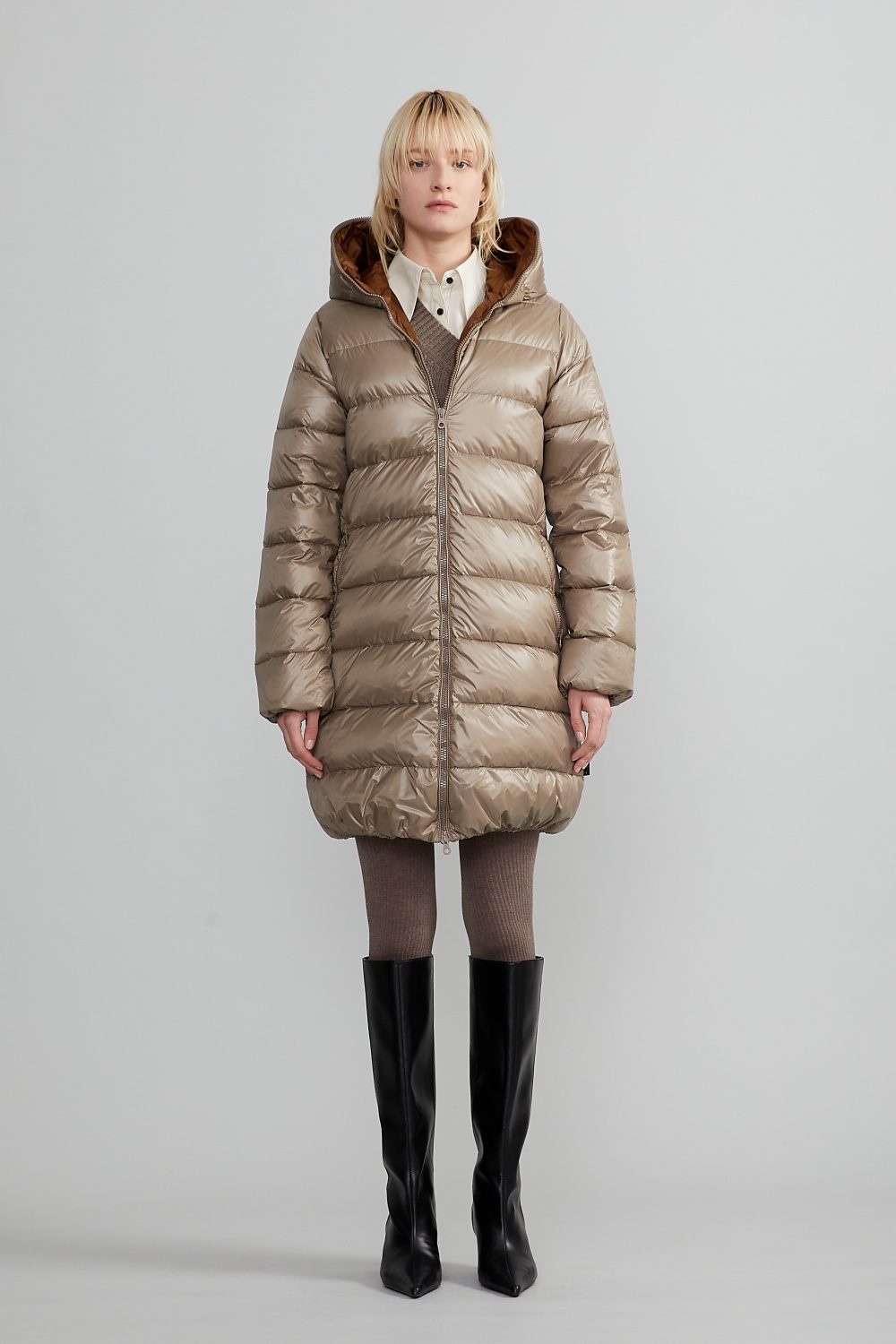 軽さ・防寒性・エレガンスを兼ね備えたミドルレングスダウンコート「ACERIONEQUATTRO(アチェリオネクアトロ)」。ひざ上まで包み込む絶妙な丈感と、しなやかな曲線の立体シルエットが、品格ある冬の装いを演出。