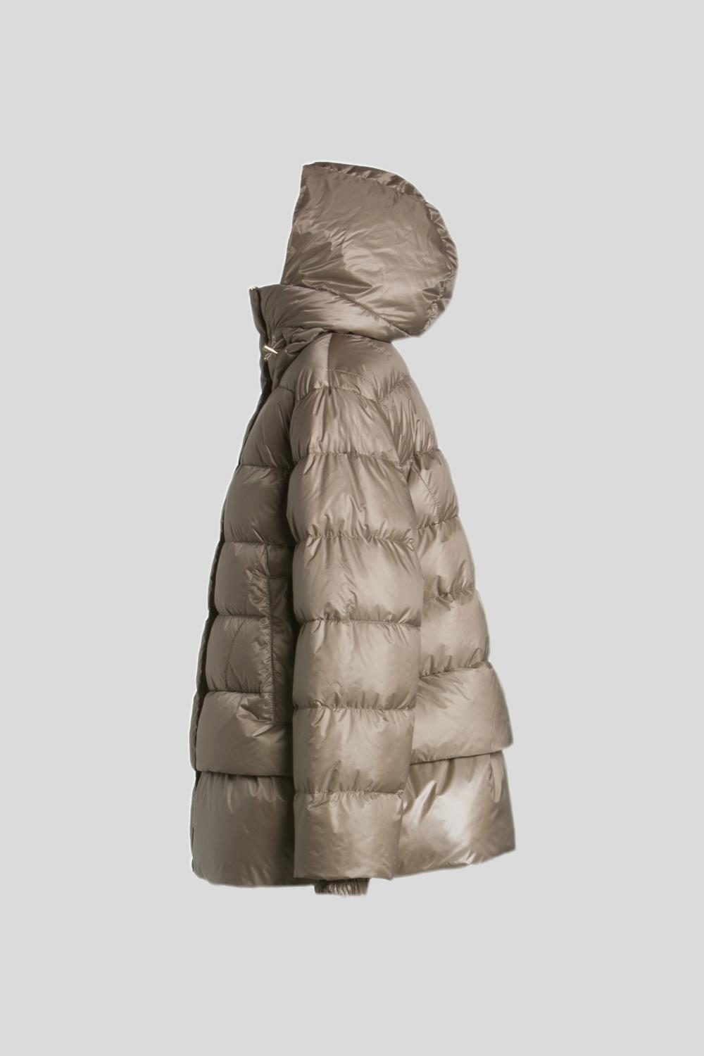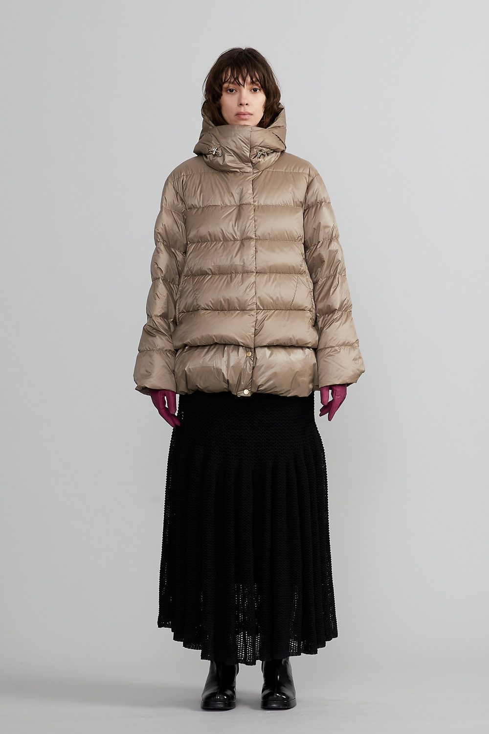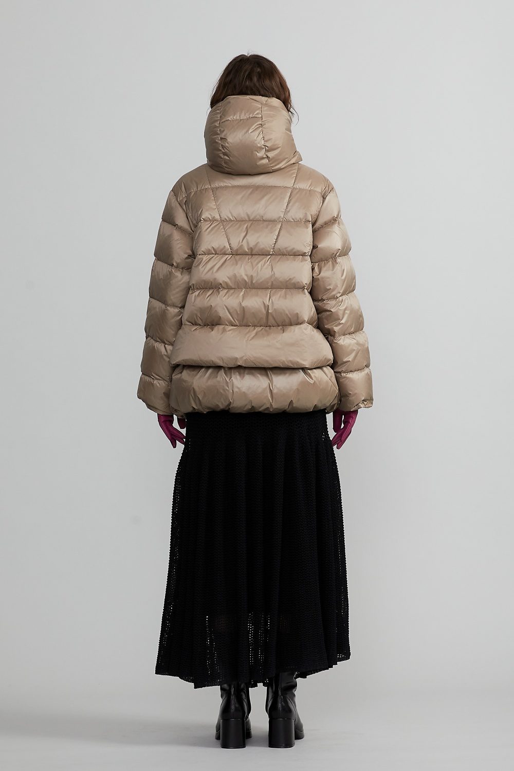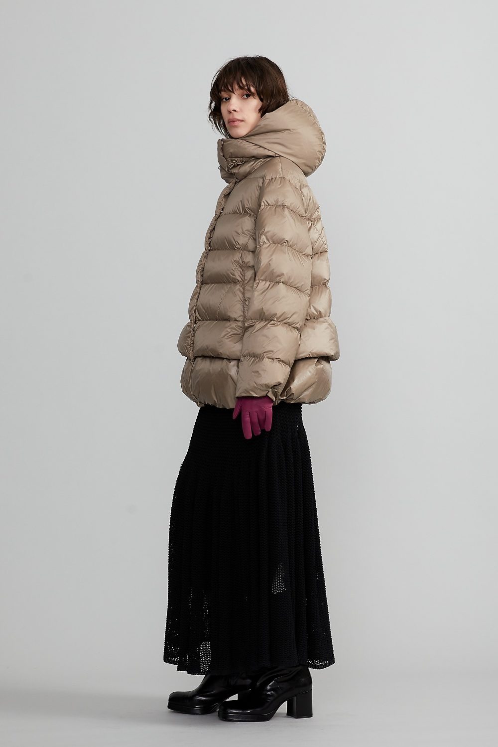ボリューム感と軽やかさを融合させたショートダウンジャケット「ADSILA(アドシラ)」。ダウン特有の丸みとボーダーキルティングが、暖かさはもちろん、スタイリッシュで都会的な印象を与える一着。ハイネック一体型フードの構造により、顔まわりを包み込むような防寒性と洗練されたシルエットを両立。裾に向かって広がる緩やかなAラインが、立体感のあるモードな雰囲気を演出します。