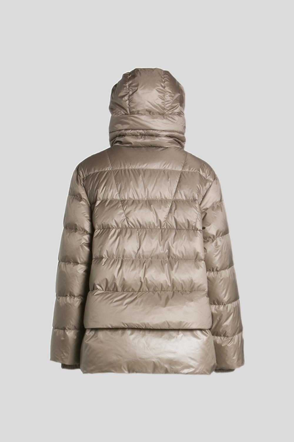 ハイネックとフードが一体化した立体フォルムが特徴。ドローコード調整可能。