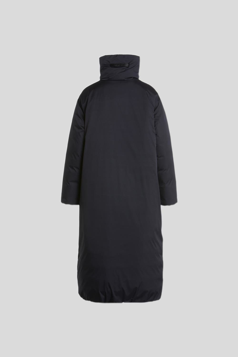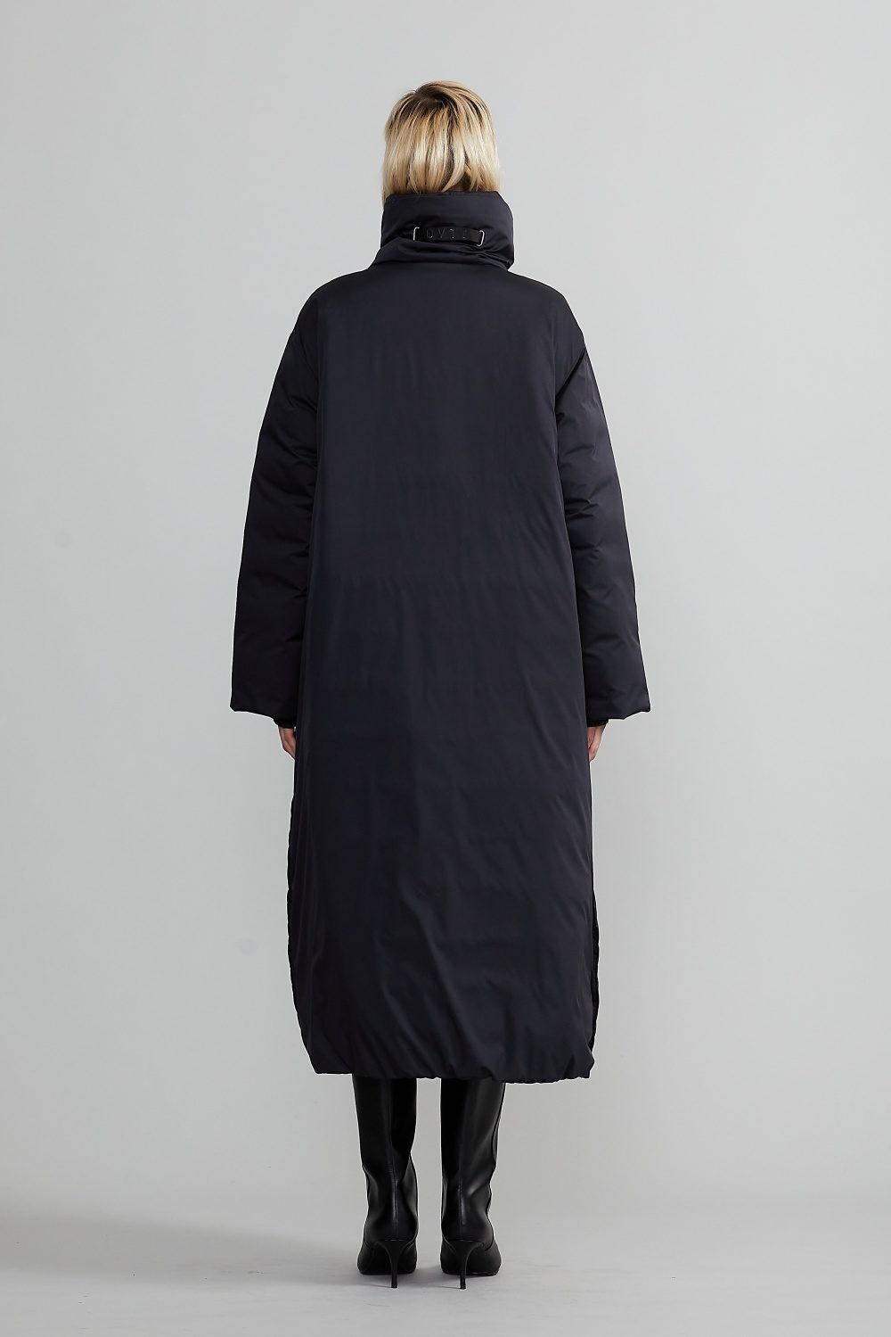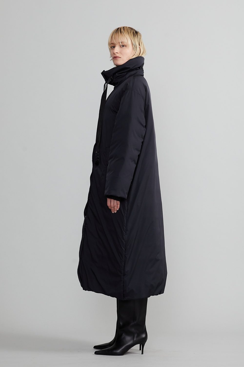 首元まで包み込む立体カッティングにより防寒性とデザイン性を両立、衿を倒せばショールカラー風デザインにも。
