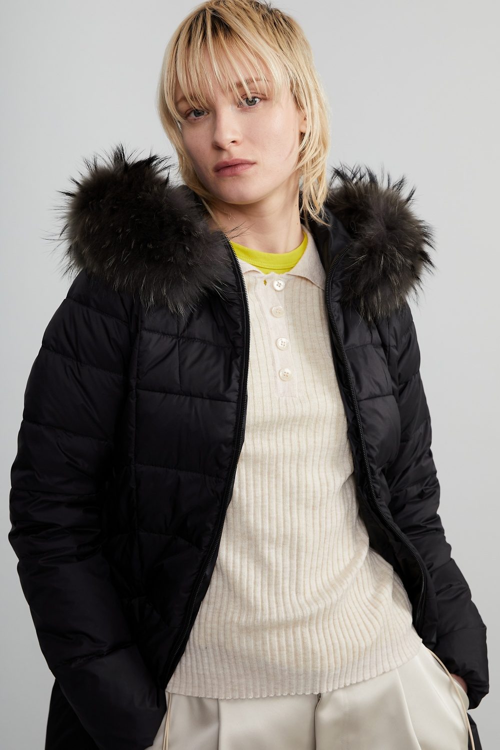 フードにあしらわれたフォックスファーまたはラクーンファーは、顔まわりを華やかに彩りつつ、防寒性も高めるアクセントに。ファーは取り外し可能で、シーンや気分に応じてスタイルチェンジが可能。