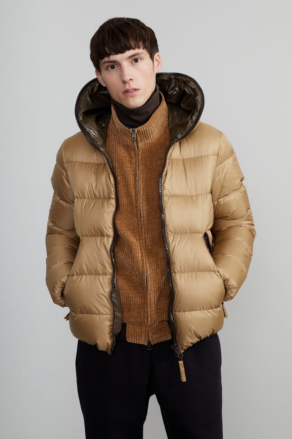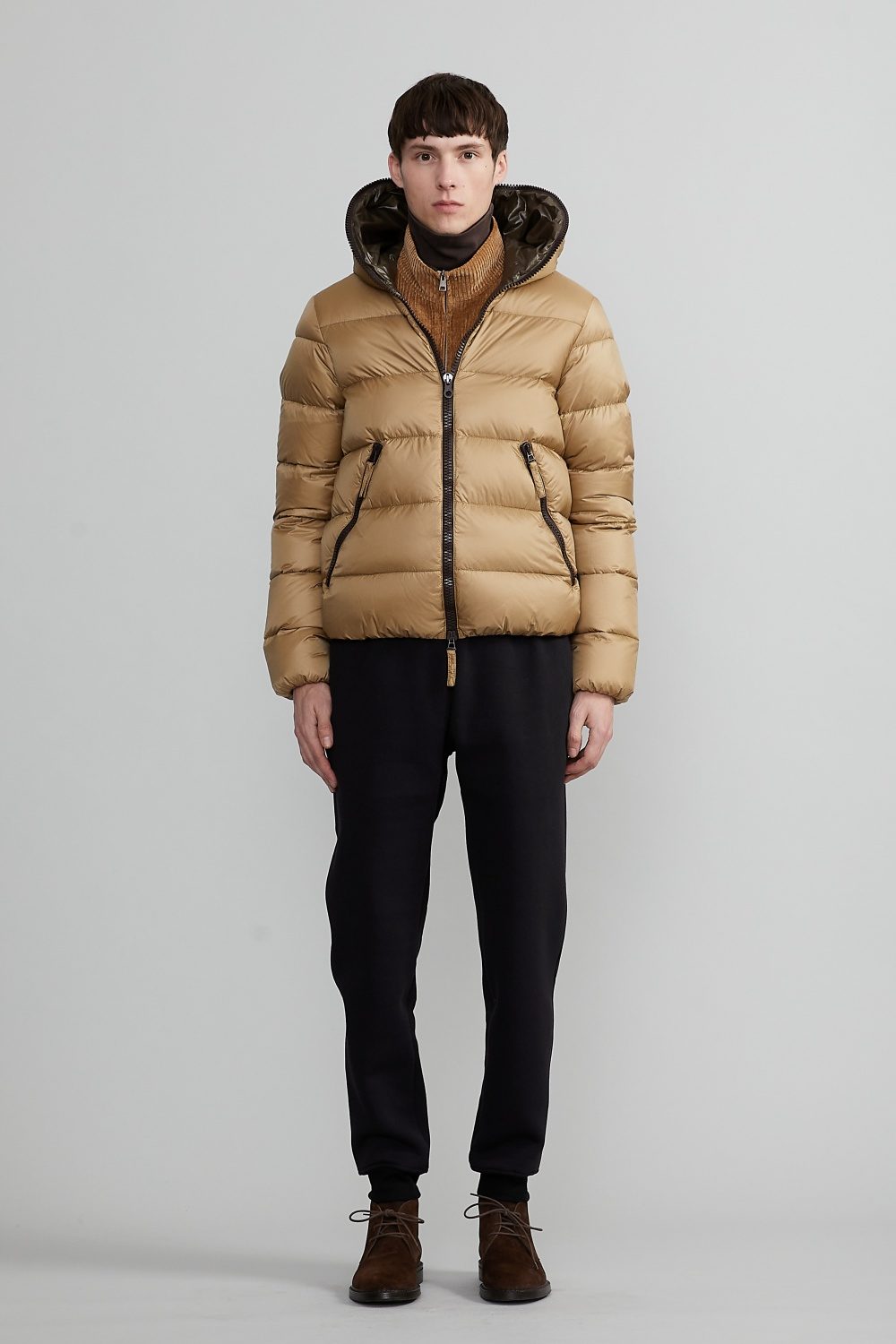 フードトップまで続くダブルファスナー仕様のフルジップアップデザインは、DUVETICAを象徴するブランドアイコンのひとつです。
