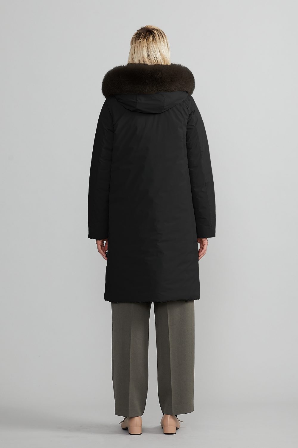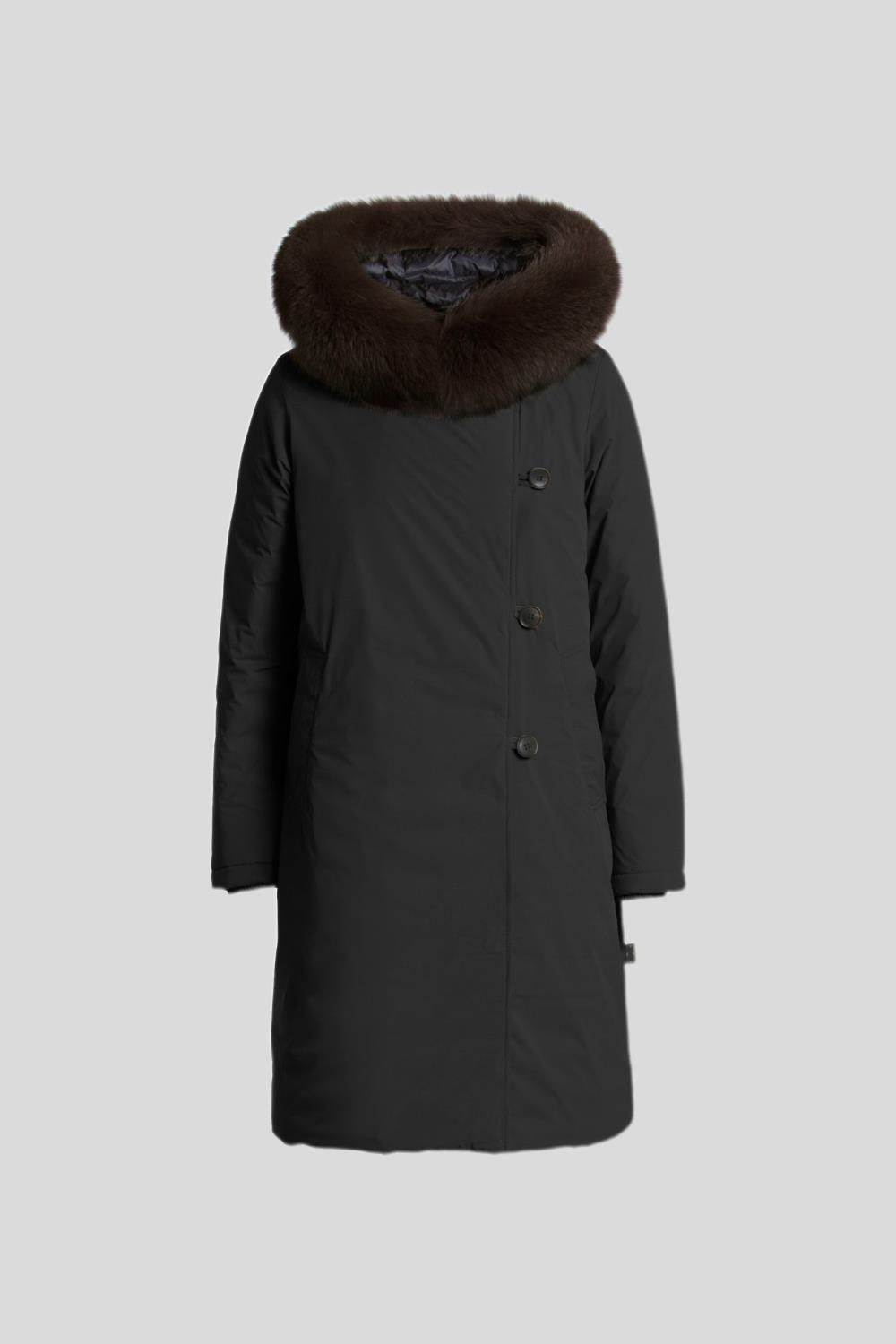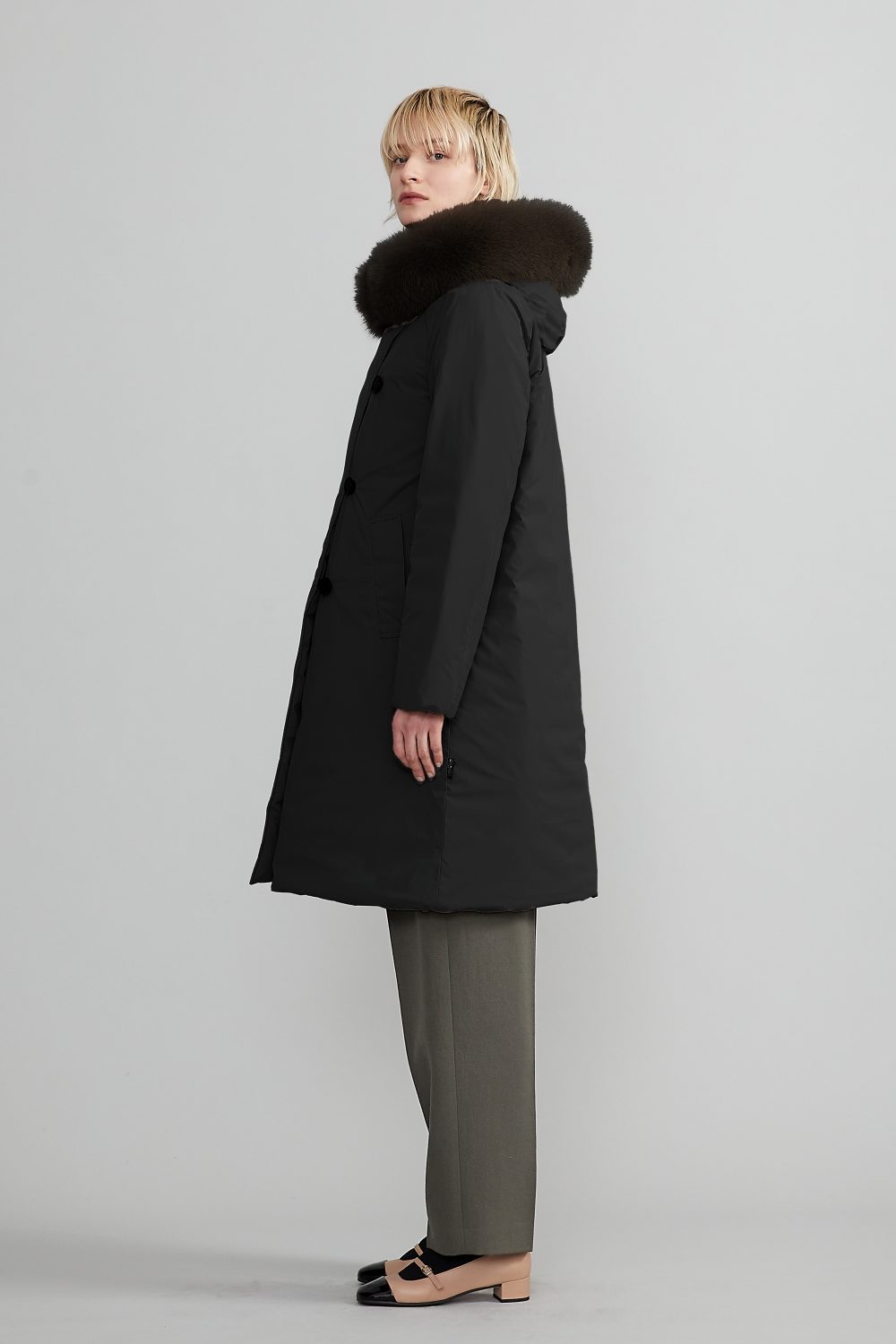洗練された構築美とラグジュアリーな素材感を融合させたロングダウンコート「FINGUARADUE(フィングアラドゥエ)」。左右非対称のデザインと3つのループボタン、たっぷりとしたファーが印象的で、気品と暖かさを両立。大人の冬スタイルを格上げするミリタリーエレガントなデザインです。