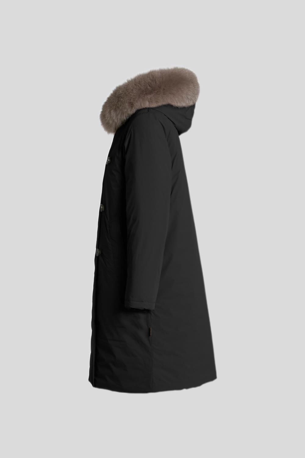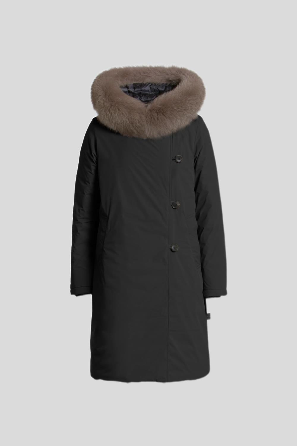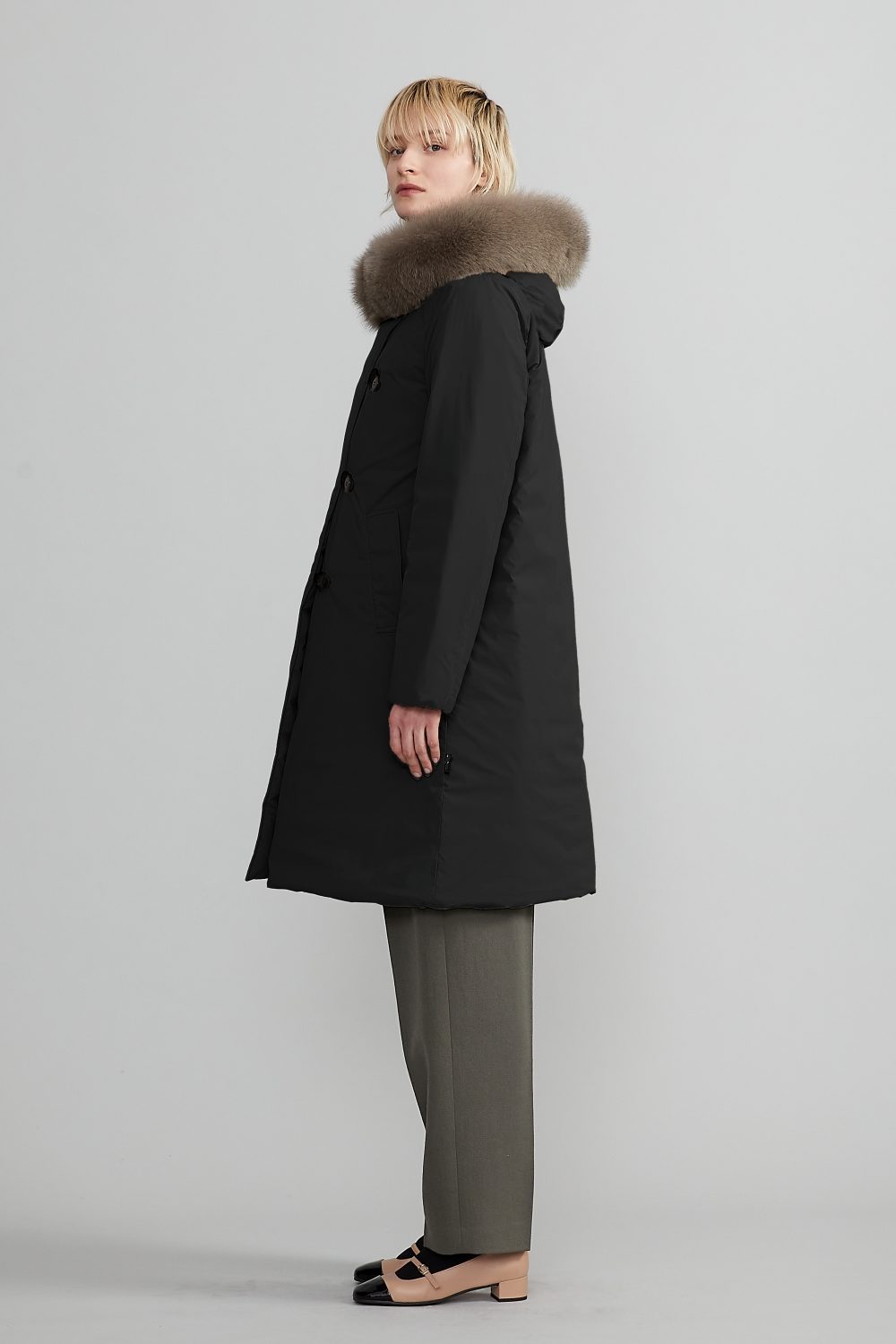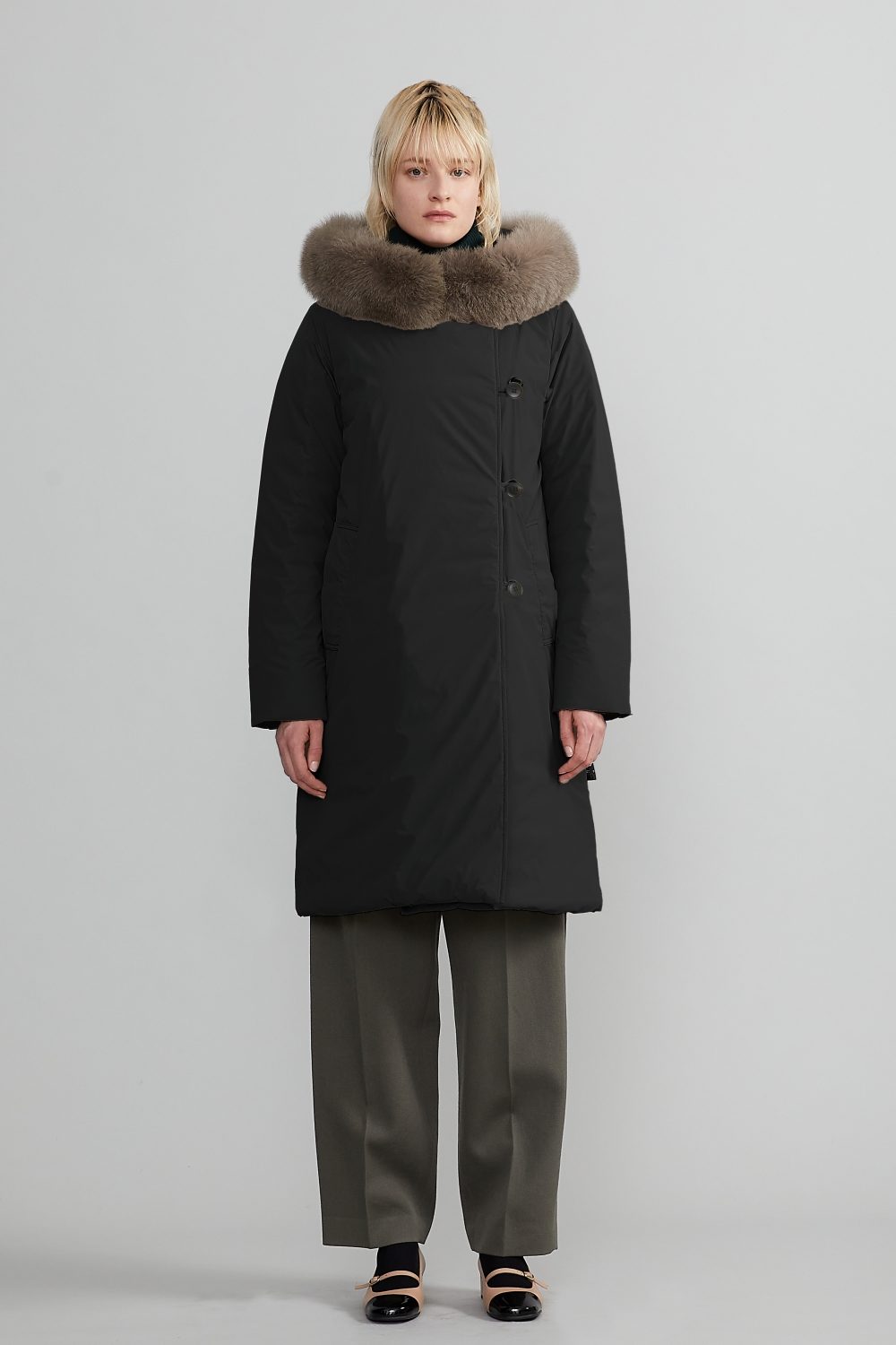 洗練された構築美とラグジュアリーな素材感を融合させたロングダウンコート「FINGUARADUE(フィングアラドゥエ)」。左右非対称のデザインと3つのループボタン、たっぷりとしたファーが印象的で、気品と暖かさを両立。大人の冬スタイルを格上げするミリタリーエレガントなデザインです。