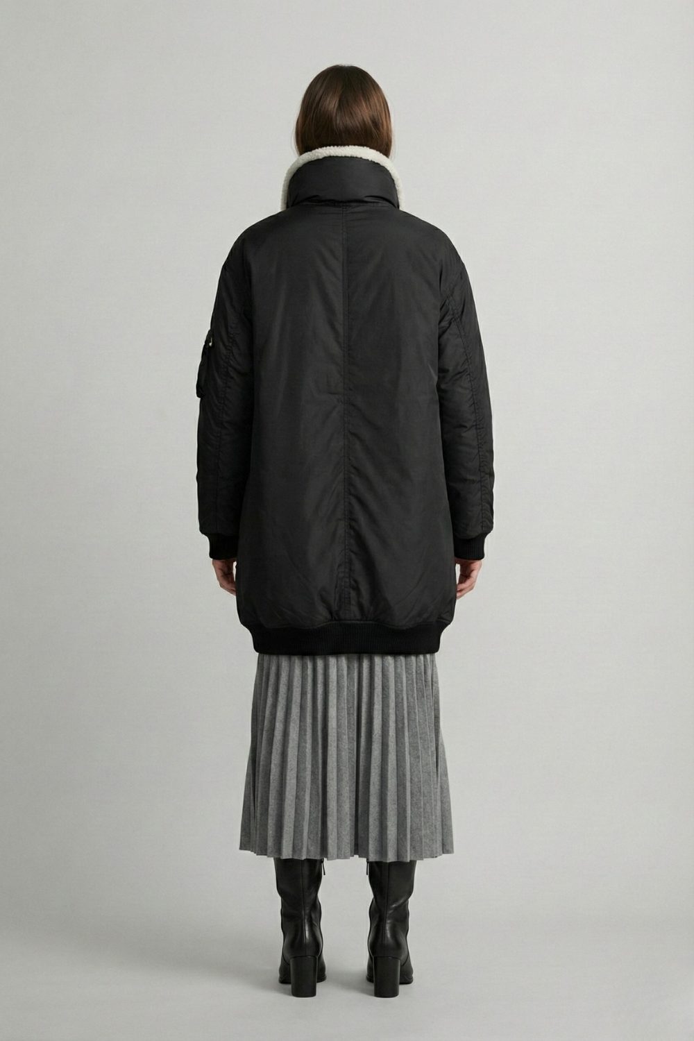 ミドル丈でありながら、リブ仕上げの裾と袖口がMA-1らしい無骨さを演出。ゆったりとしたオーバーサイズでありながら、モダンでクリーンな印象を保っています。