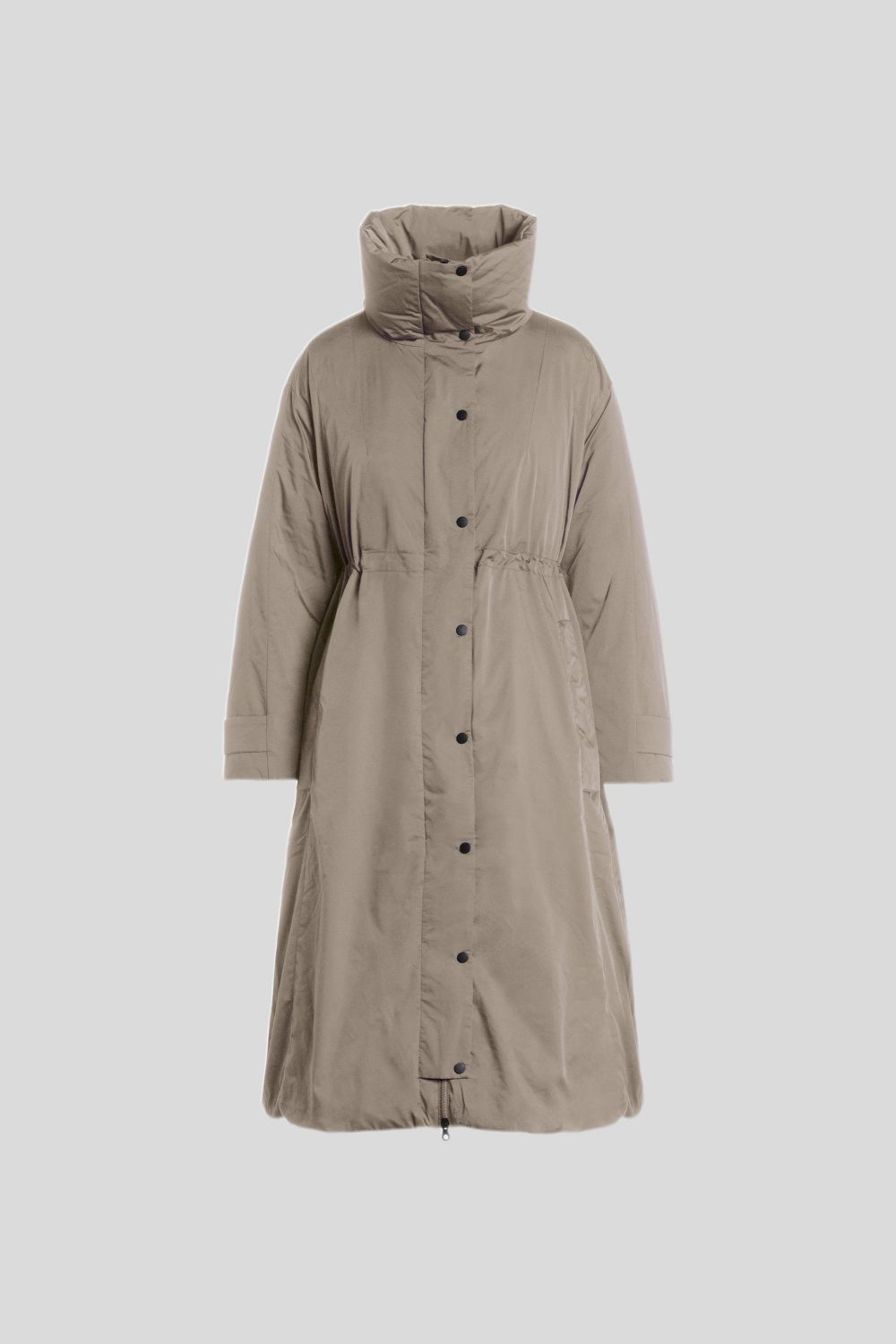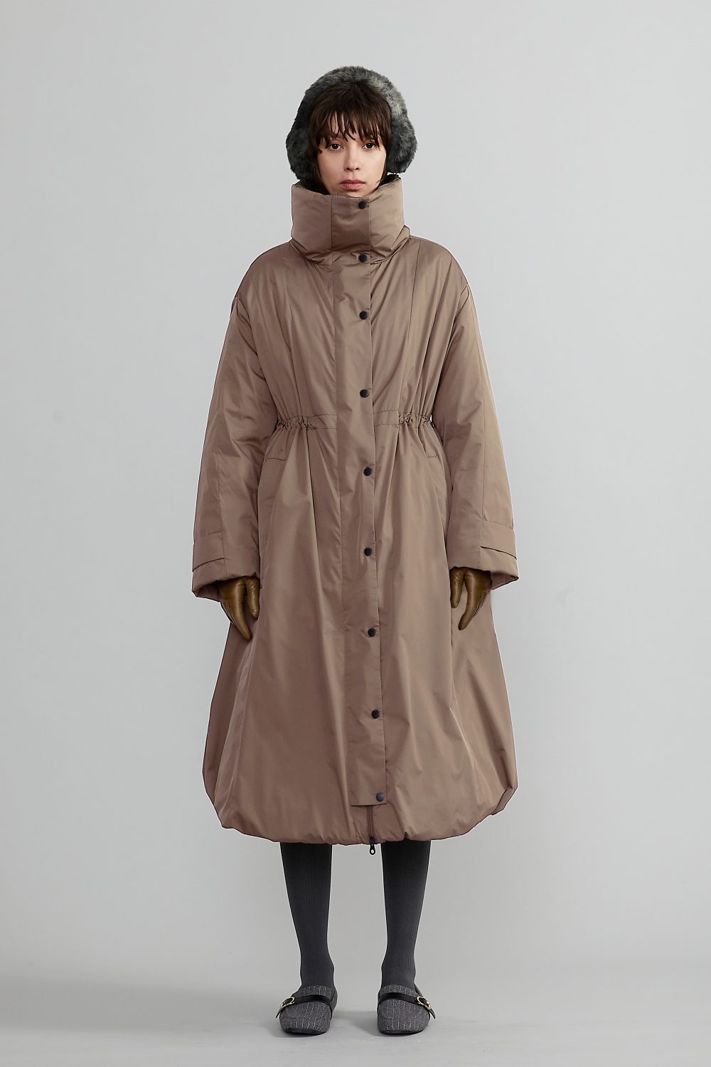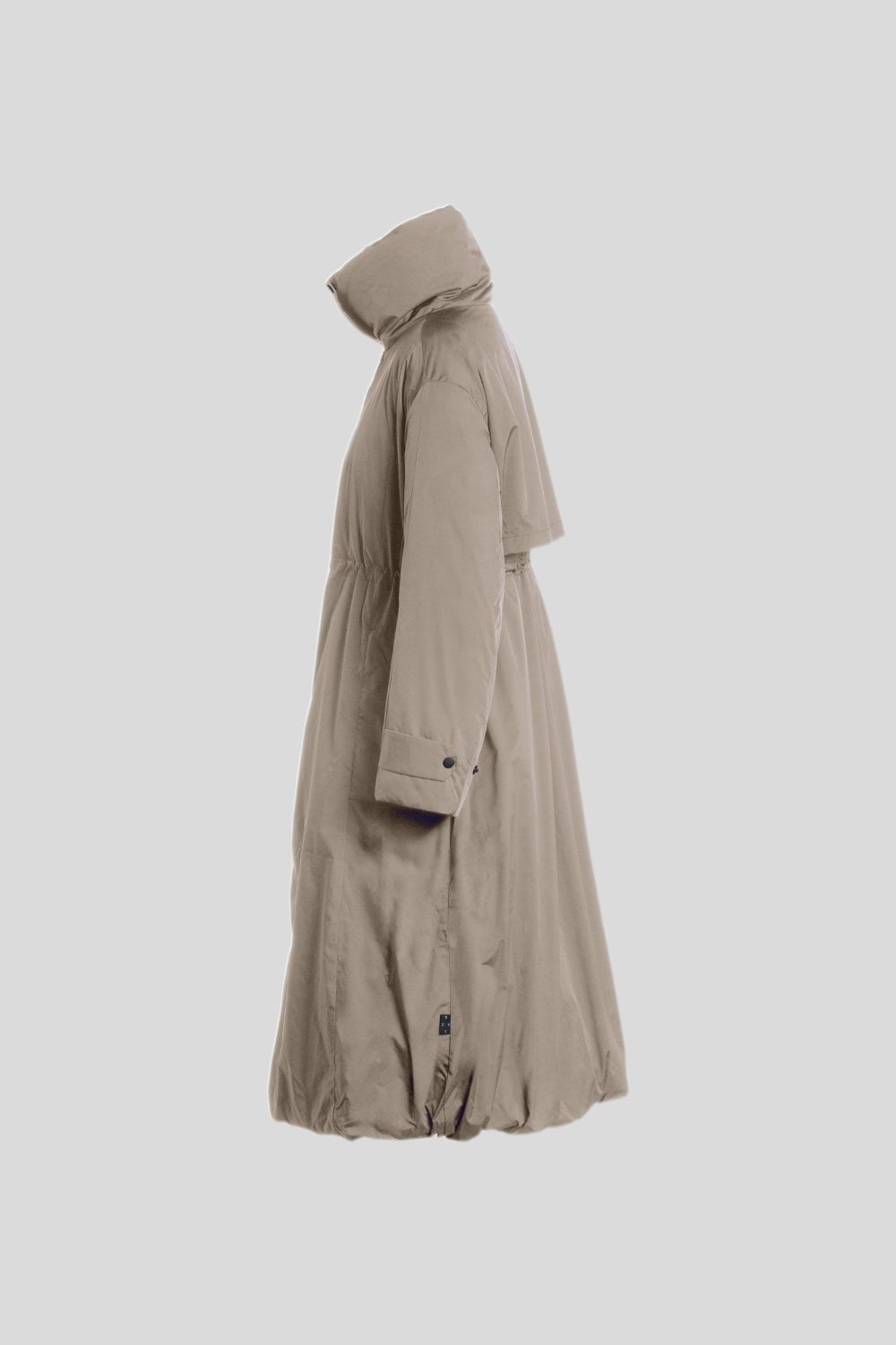 Aラインの裾はドローコードで調整可能。裾を絞ることで2WAY仕様に。バルーンシルエットが楽しめる着回し自在な一着。