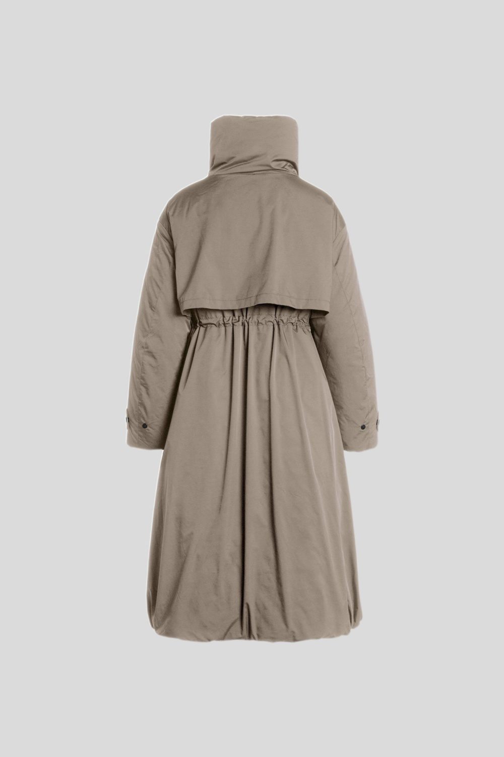 背面のヨーク切り替えとウエストのドローコードにより、ギャザーが効いた立体感のあるシルエットを実現。