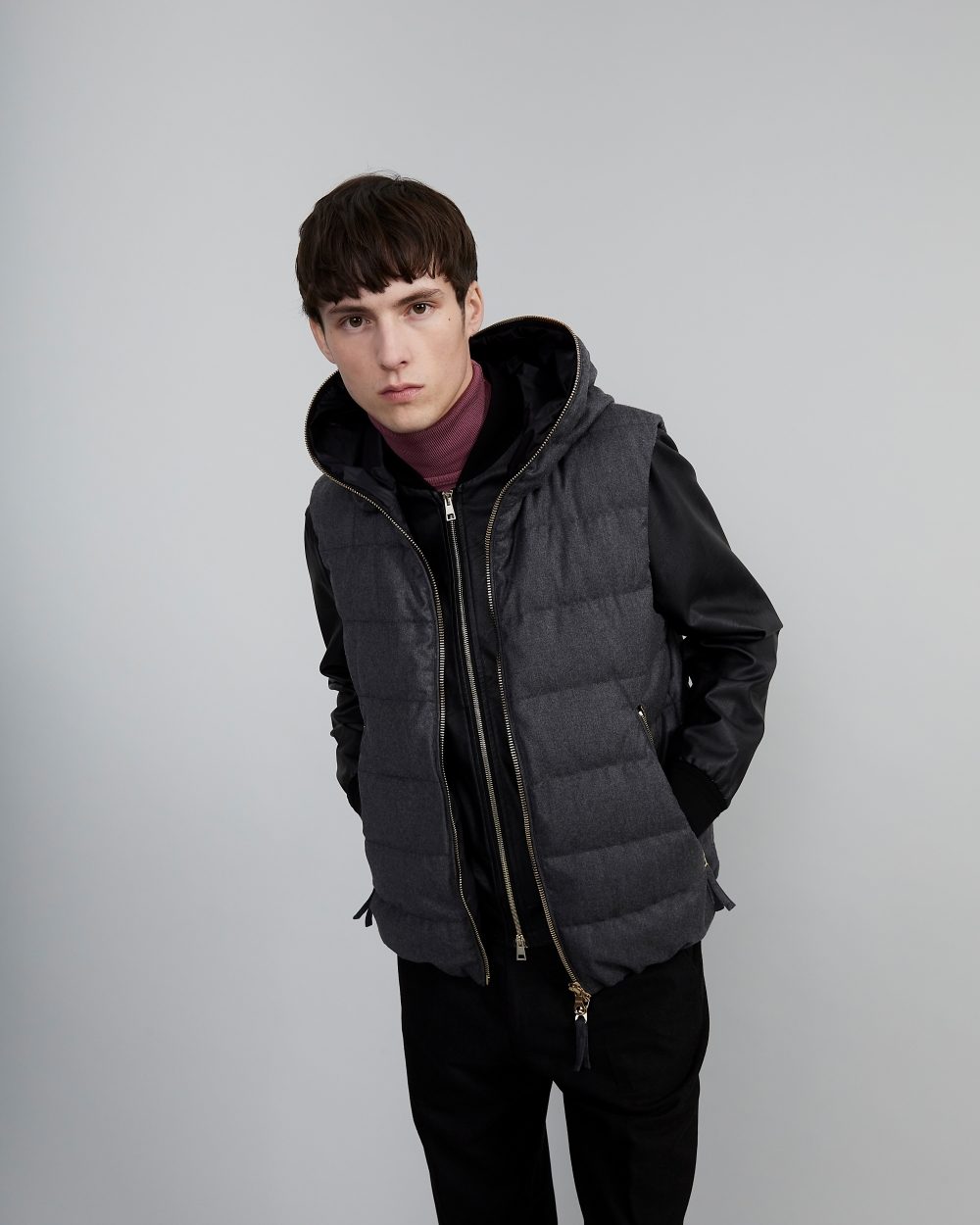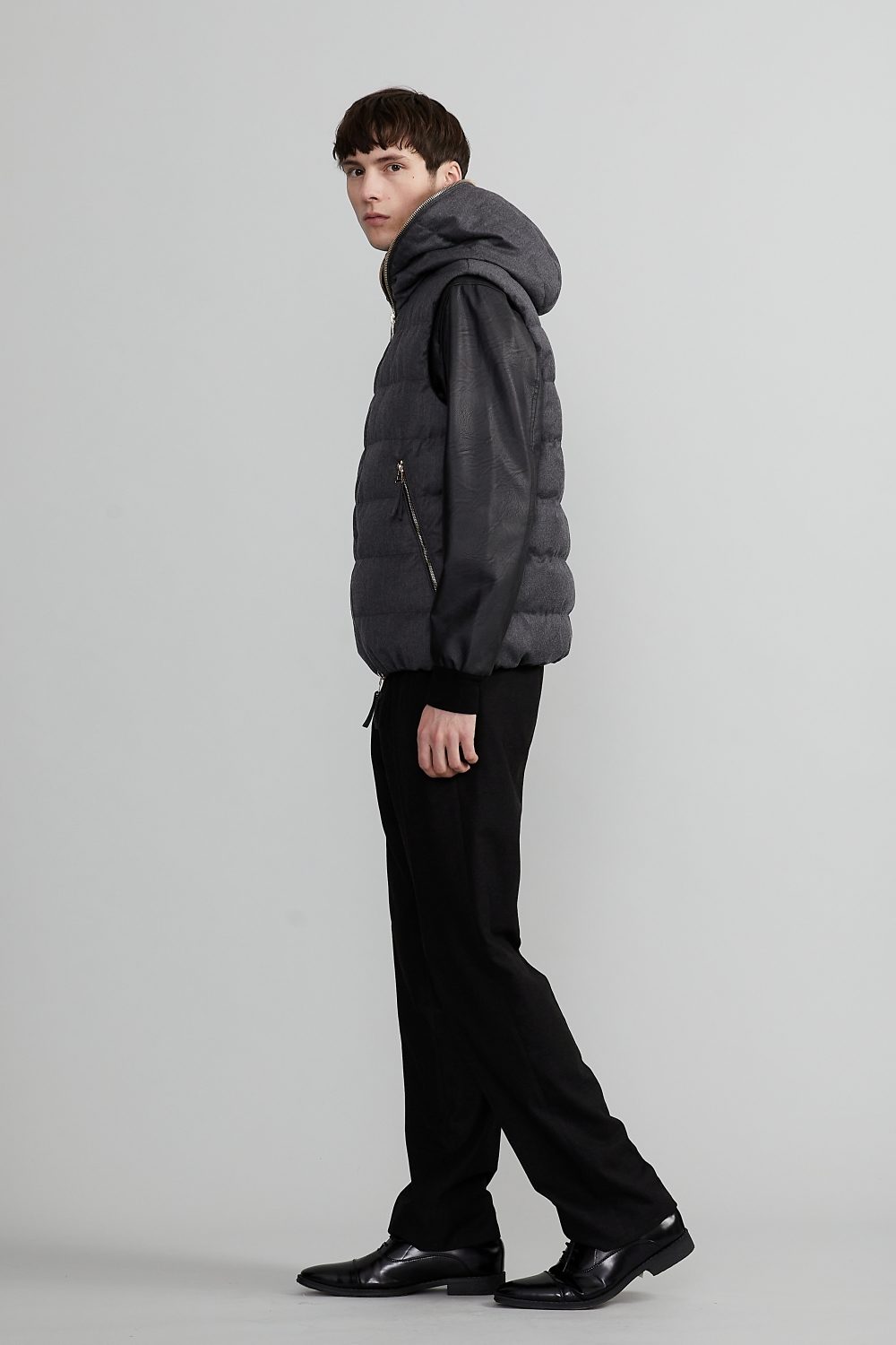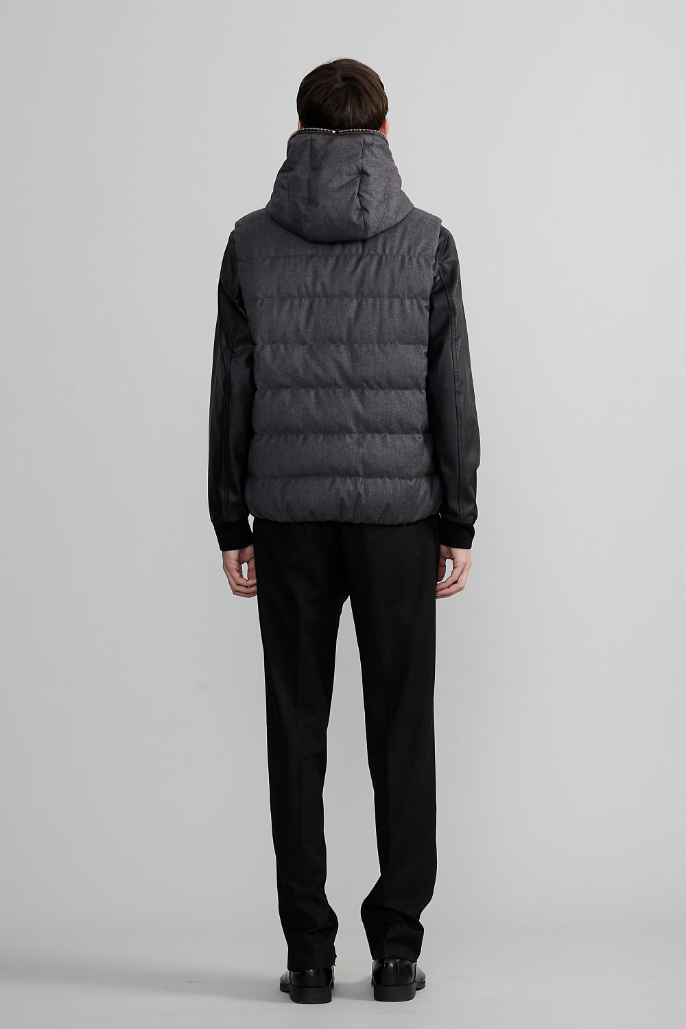 高めに設計されたネックラインと一体型フードにより、首元までしっかりと保温。立体的なシルエットが顔まわりを引き締め、スタイリッシュな印象に。