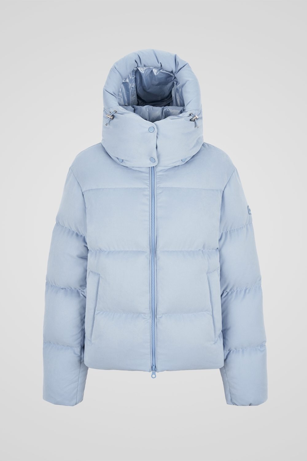 透明感のあるライトブルーが目を惹く、DUVETICAのショート丈のダウンジャケット「TORISA SUEDE / トリサ スエード」。柔らかなスエード調素材を表素材に使用することで、上品で軽やかでクリーンな色合いが、スタイリングに明るさを添え、冬の装いを華やかに演出します。首元を立体的に包み込むフードは、取り外し可能で2WAYのスタイルにアレンジできます。フロントのダブルジップやポケットなど、使いやすさを追求したディテールを随所に配置。DUVETICAロゴプレートがアクセントになり、都会的なモダンスタイルからカジュアルなデイリーコーデまで幅広くさまざまなシーンで活躍します。